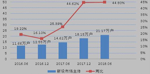 从近两年企业占比来看,增幅较大。2016年、2017年、2018年上半年企业总量分别占市场主体总量的42.9%、46.6%和49.13%(详见图3)。
